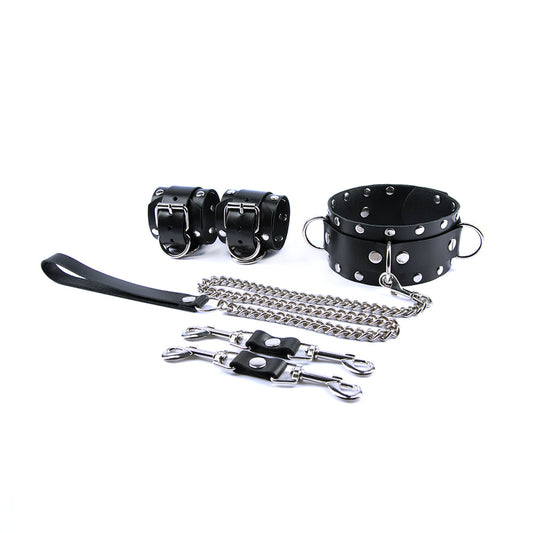 - БДСМ набори включають наручники, нашийник з повідцем та коннектори з масивними карабінами
